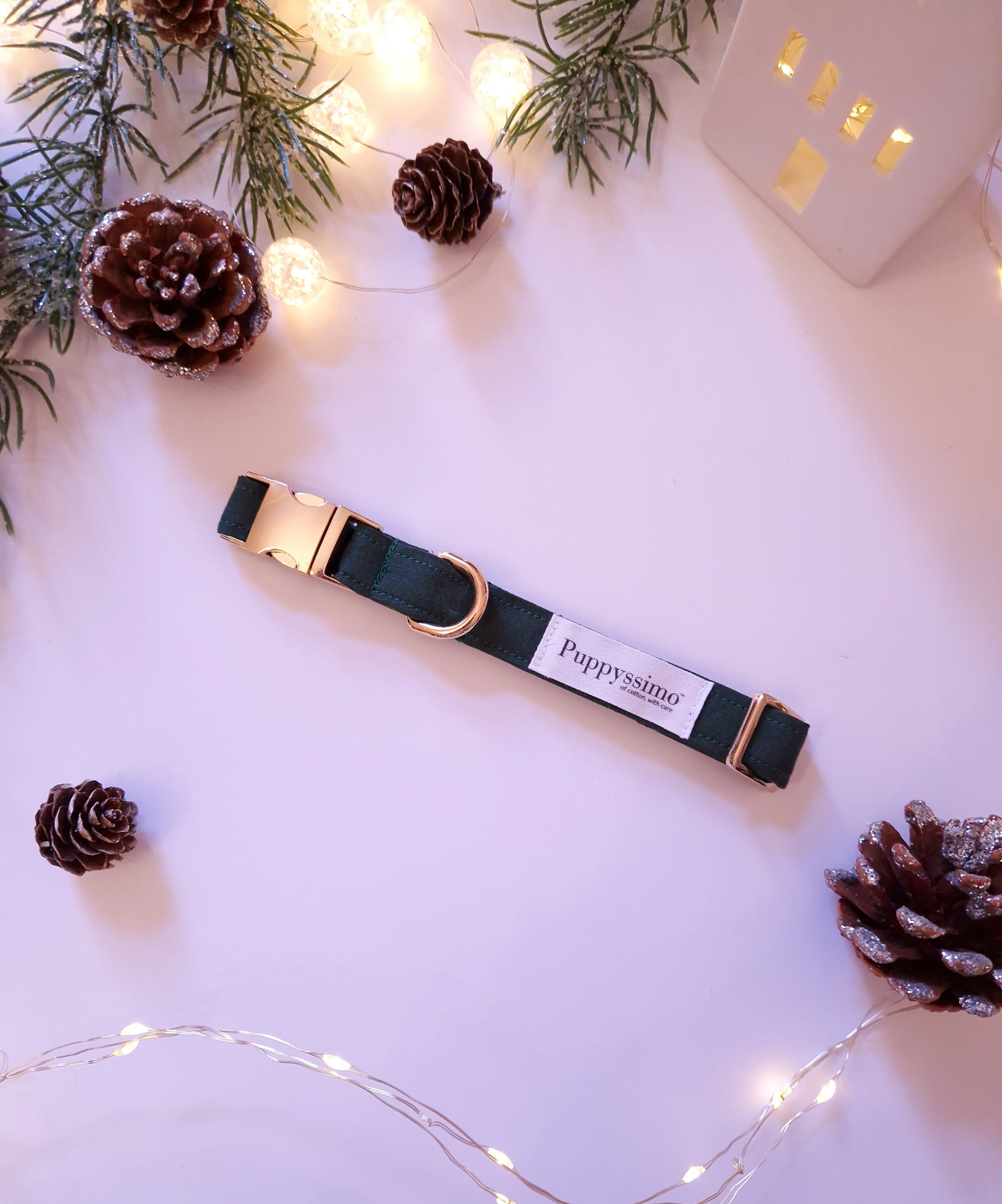 Natural elegance meets comfort in the Forest collar, made from 100% cotton fabric in a luxurious dark green shade. With an inner cotton webbing for added security and softness, and a gold zinc alloy buckle for a sophisticated finishing touch, the collar is ideal for all dogs, including those with sensitive skin.
