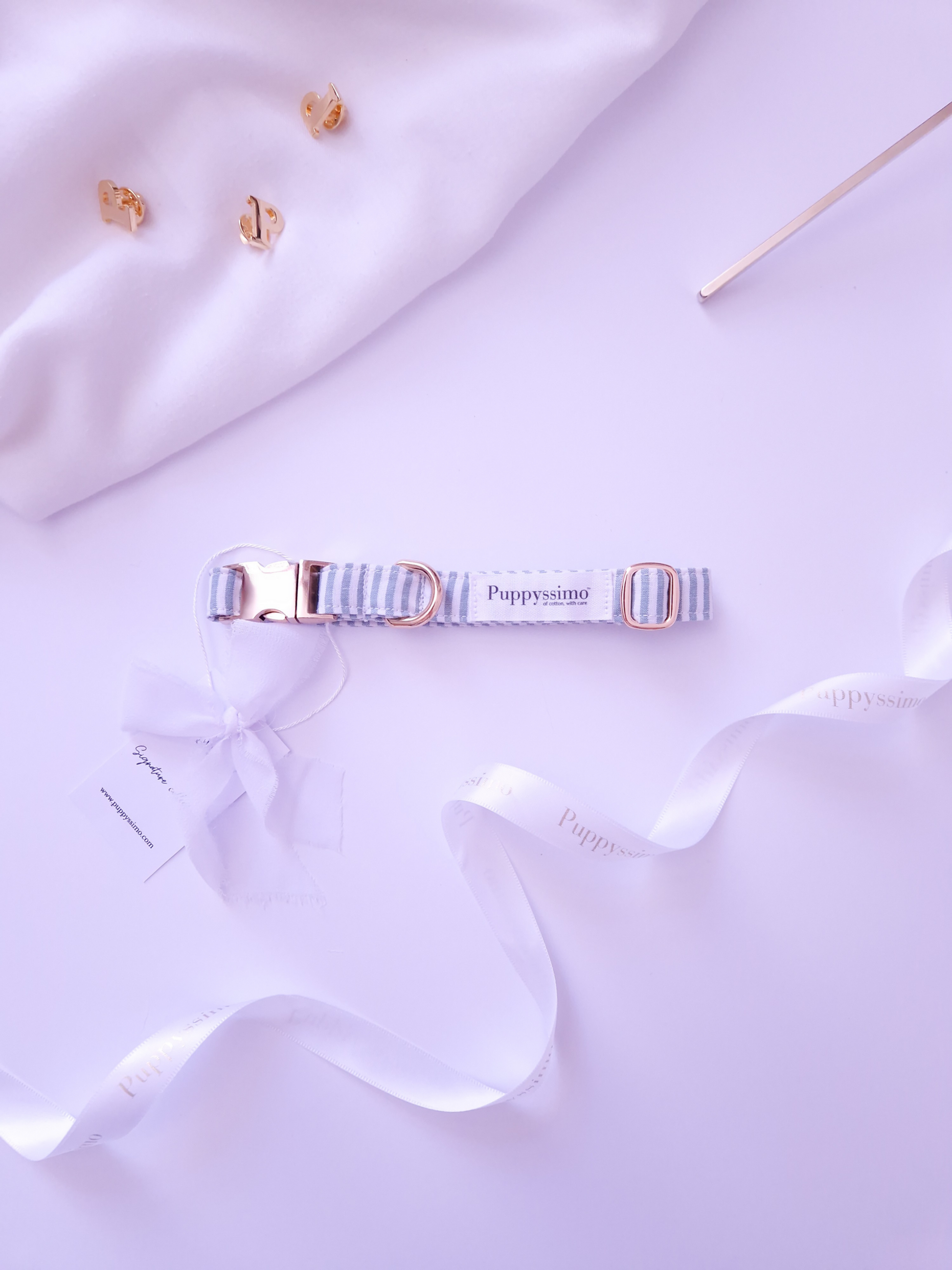 Fresh and chic, the Minty Stripes collar in color mint with white stripes brings a touch of luxurious style to every walk. Handcrafted from 100% certified cotton, it is soft and hypoallergenic, ideal for dogs with sensitive skin.