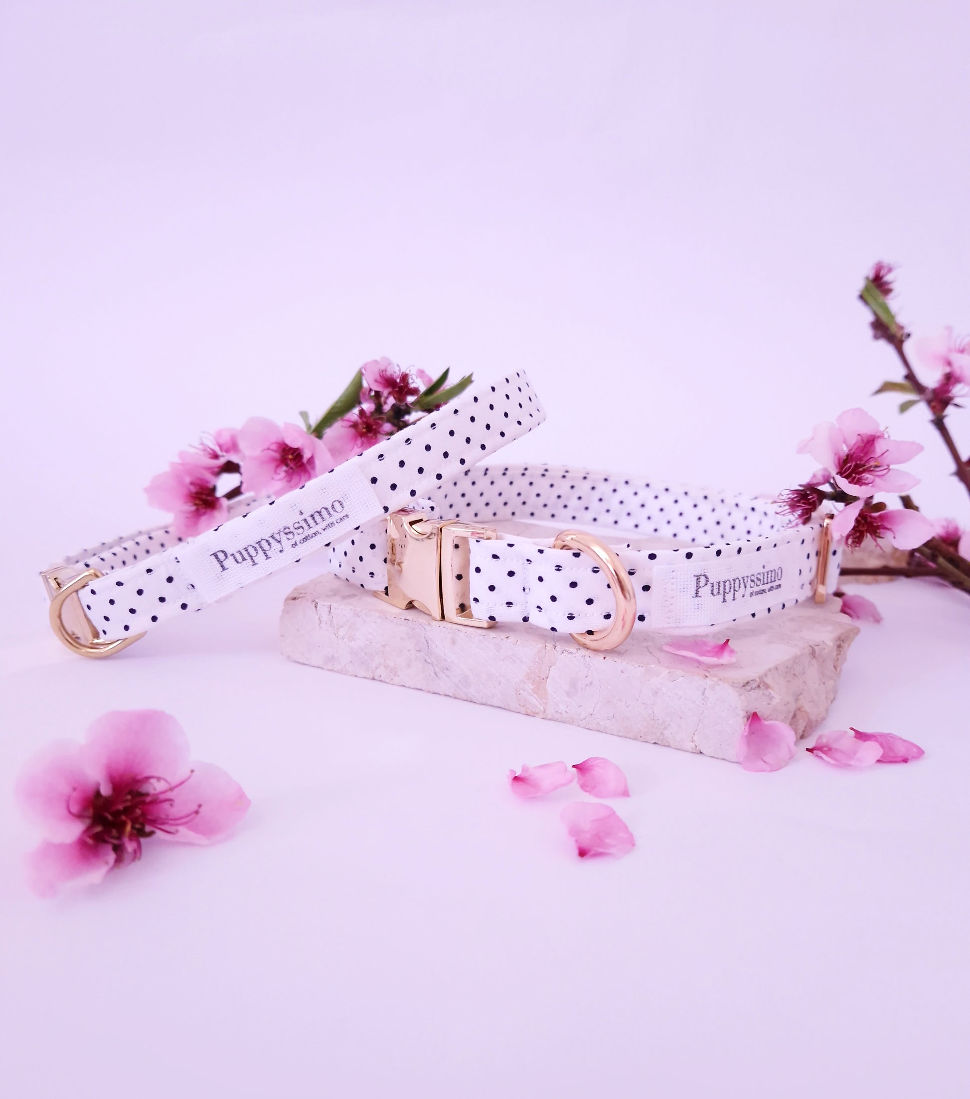 As charming as a walk through the streets of Paris, the Parisienne collar in white with black dots pattern brings timeless elegance to every step of your pet. Delicate and refined, it is made of 100% certified cotton, handcrafted with attention to every detail to combine comfort, safety and style. Gold details give a special luxurious finish that turns this collar into a real little fashion accessory.