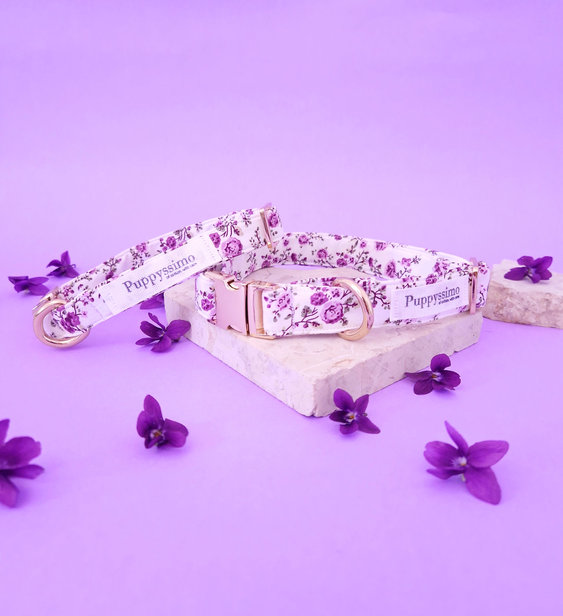 Romantic and elegant, the Purple Joy collar in white with delicate purple flowers pattern adds a refined, luxurious detail to every walk your dog takes.