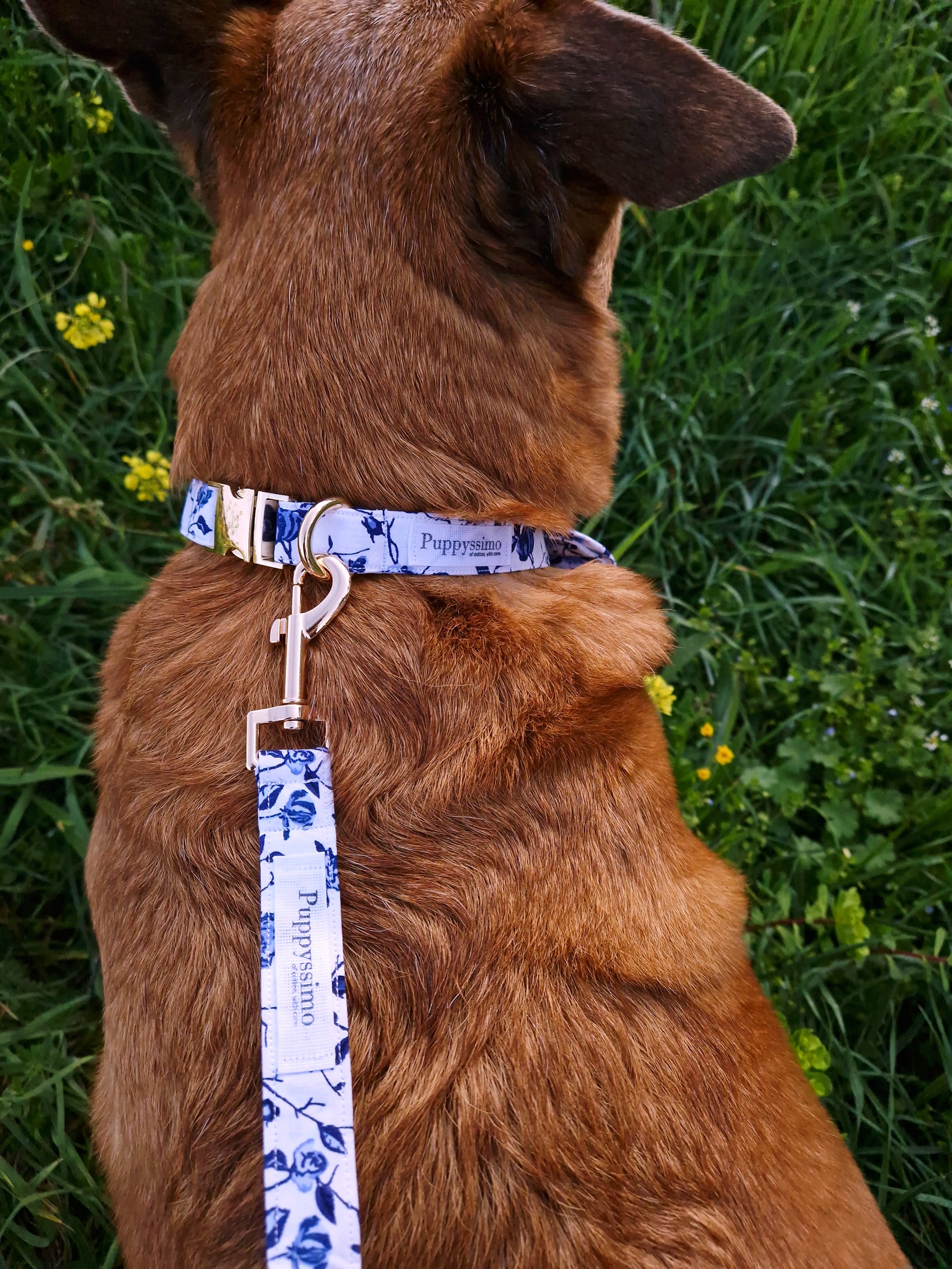 Handcrafted dog leash made of certified cotton with a Mediterranean pattern of blue flowers on a white background and strong polyamide straps inside the leash for maximum durability.