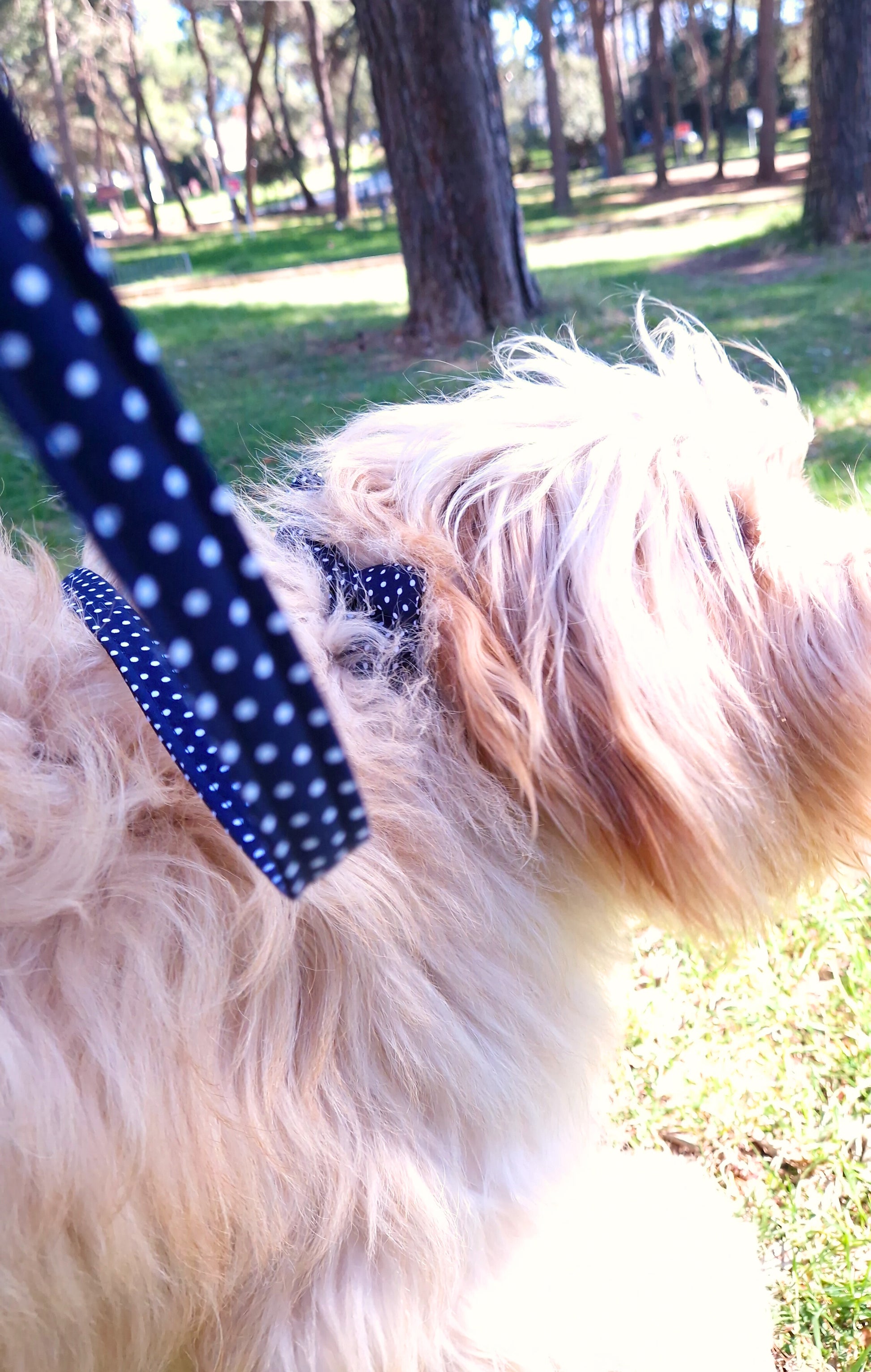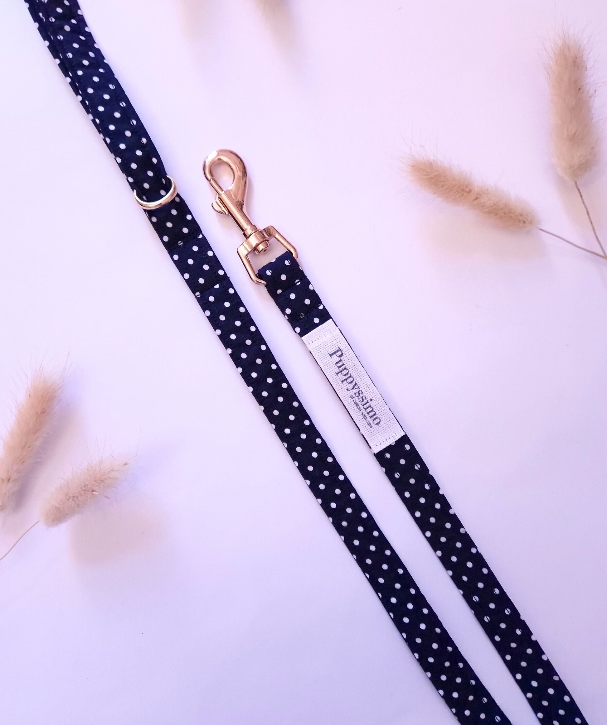 Take your pet for walks with the Puppyssimo leash in an elegant navy blue and white polka dot pattern. Made with an inner tightly woven polyamide webbing for strength and stability, and an outer fabric made of certified cotton for extra comfort.