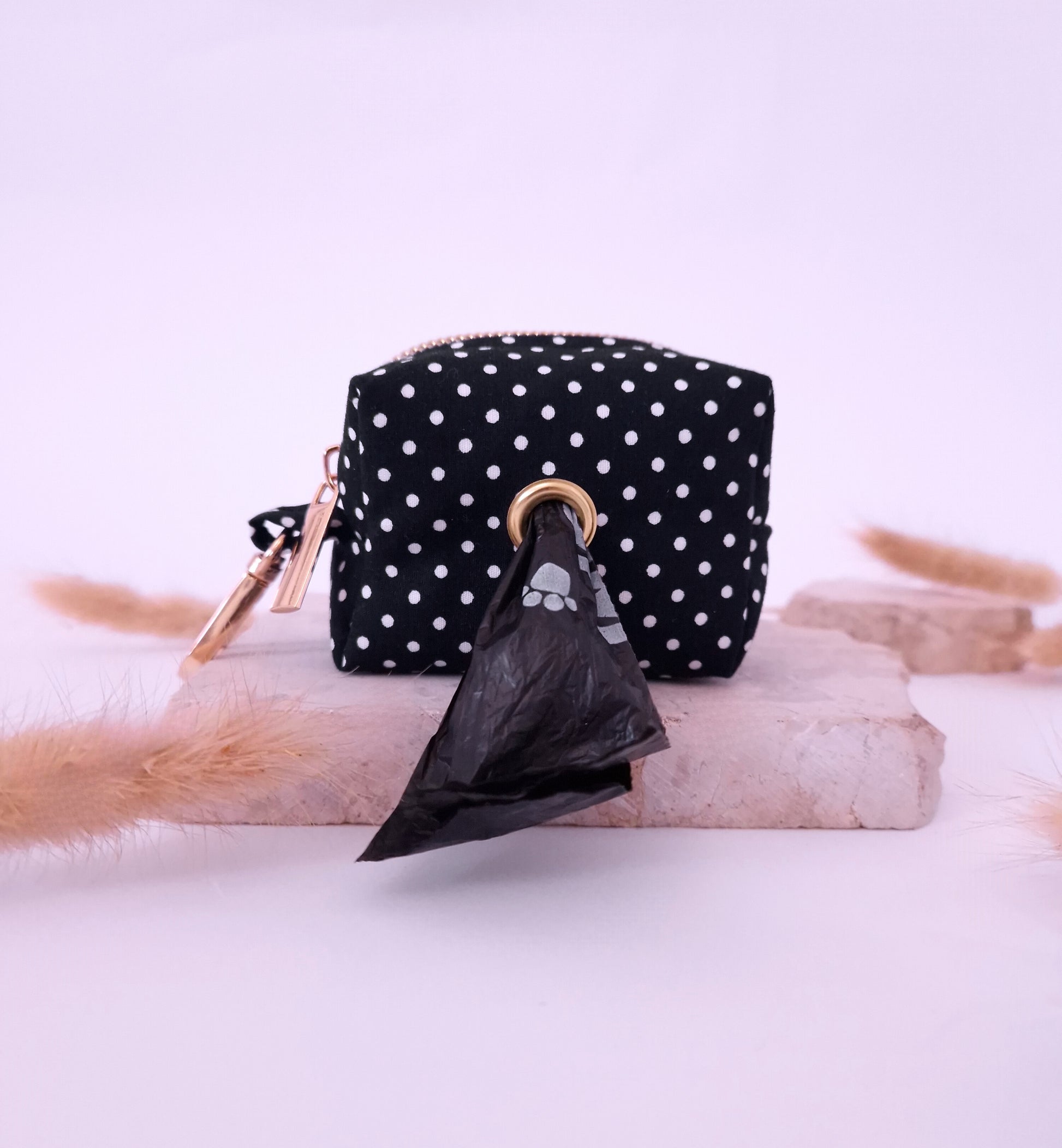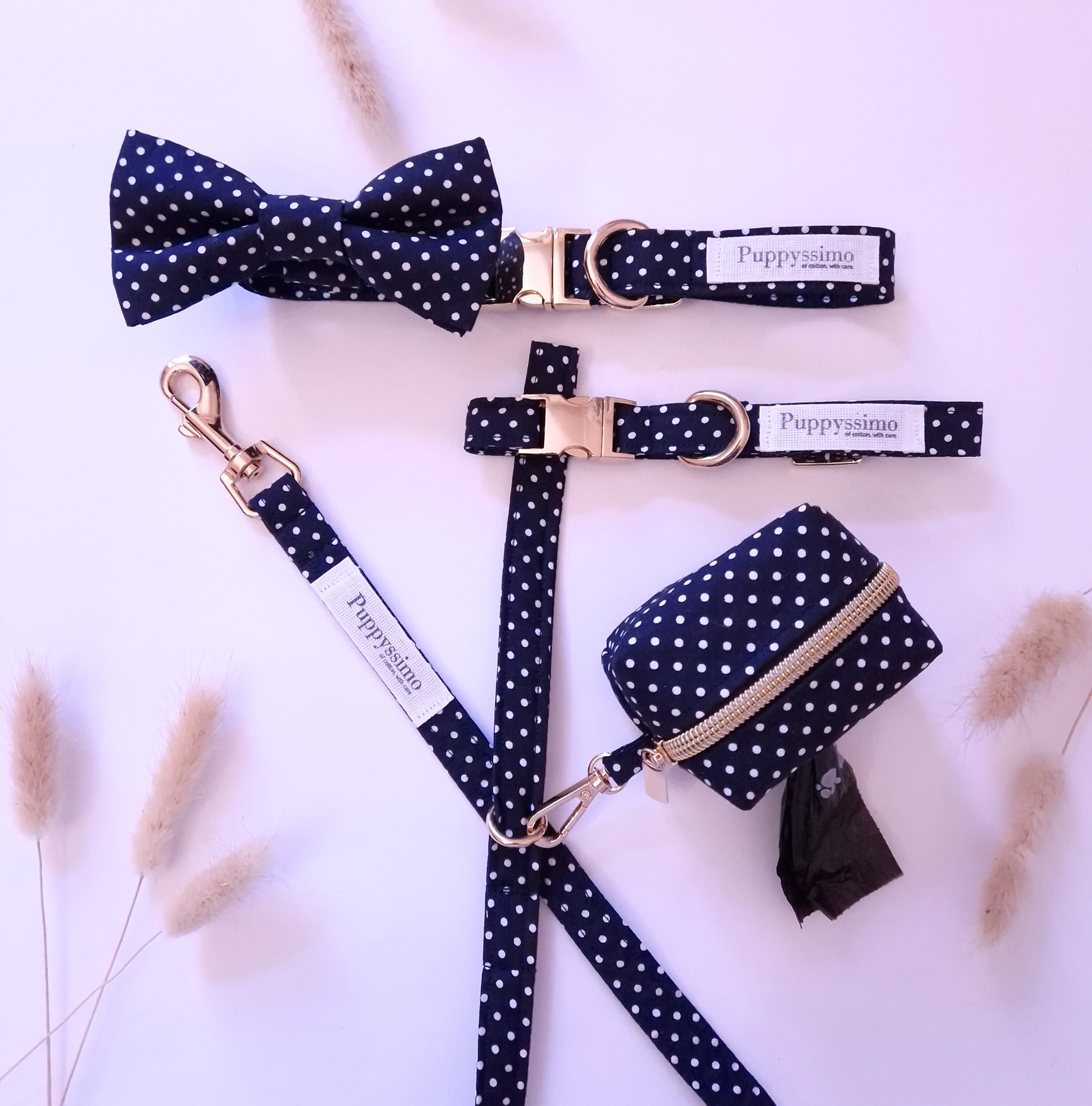 Walking with your pet has never been more elegant β and more practical! This cute Puppyssimo poop bag dispenser in a navy blue and white polka dot pattern is made from certified cotton and is handcrafted.